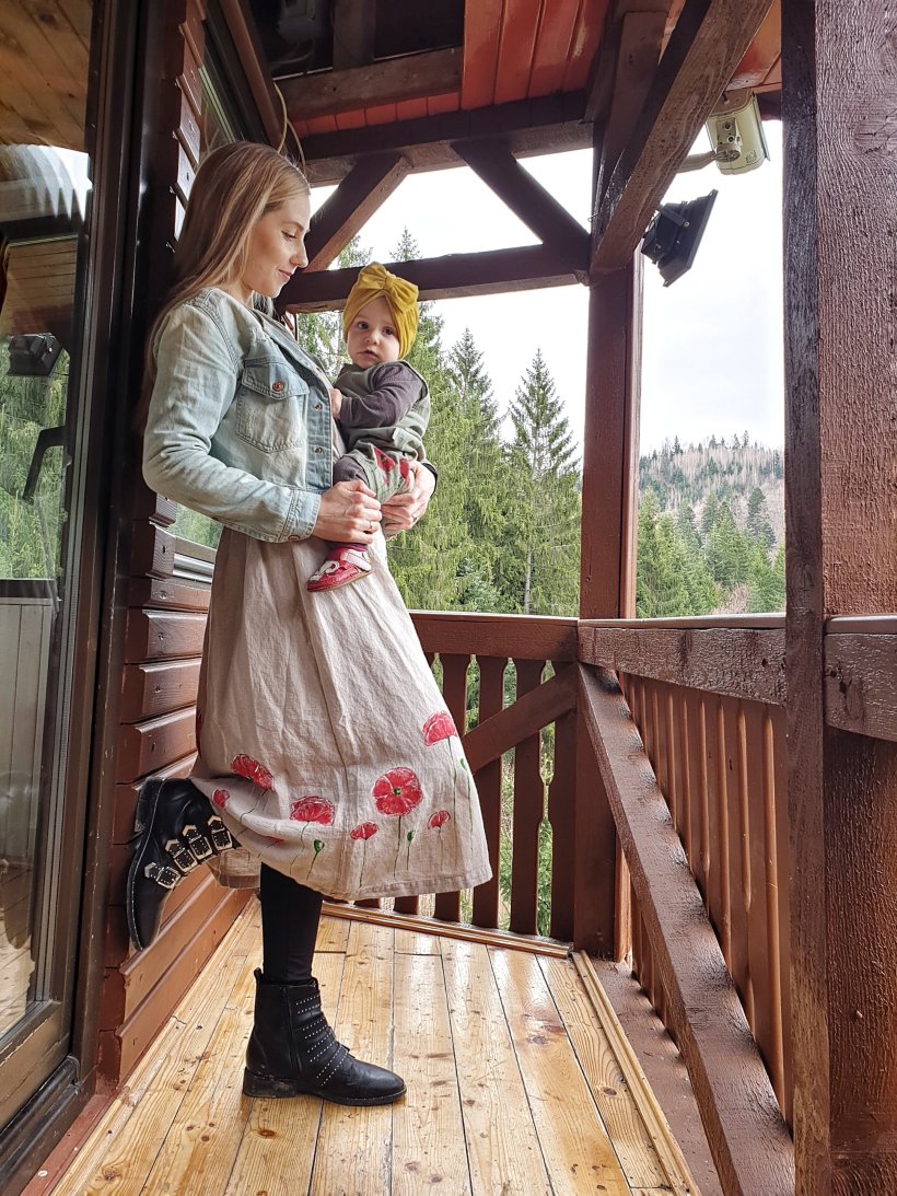 Noi ne-am relaxat în Suita Romantică, o cameră frumoasă cu pat, canapea, şemineu şi vedere spre curte. Crina a fost încântată de tot ce era nou şi pot să spun că ne-am încărcat bateriile pentru o vreme. Aşa de mult ne-a plăcut camera că am profitat de ocazie să ne probăm cu piesele de la hiphip.ro, poate poate vine vara mai repede! Eu am purtat rochia Poudre Organic in şi bumbac – natur, iar Crina summersuit-ul Poudre Organic din muselină – Oil Green. Şi pentru că am vrut atât hăinuțe comode cât şi ieşite din tipar, m-am apucat şi am pictat maci pe ele.